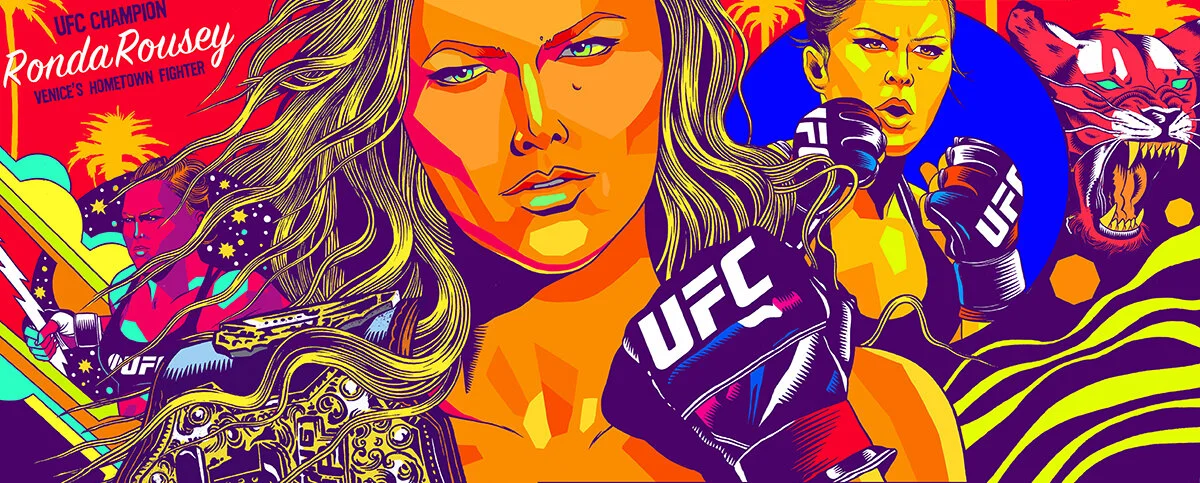 In addition to creating a hero mural onsite at their main #UFCFightWeek events center, Bicicleta Sem Freio was commissioned to create an artist portrait mural of Ronda Rousey in her home town of Venice Beach, CA. The artist duo meant to explore and interpret her power as a fighter and also her awesomeness as a young woman.